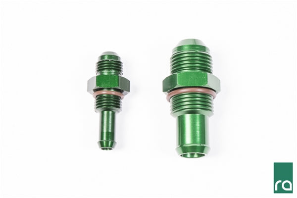 Bright-dipped green anodized aluminum bulkhead fittings.