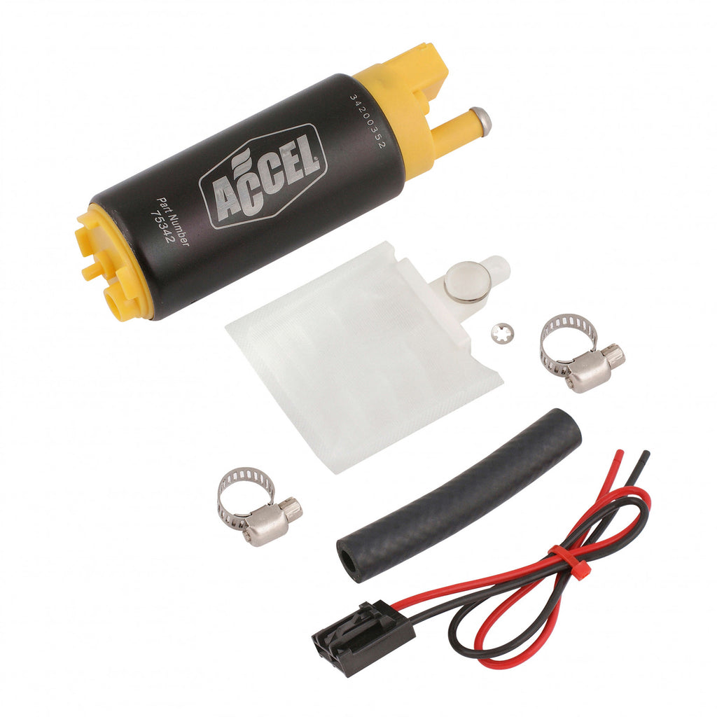 ACCEL 500 Series In-Tank electric high flow fuel pump designed to fit directly into most popular EFI applications. Great for EFI Conversion and Upgrades. Pump design supports up to 900 HP on a naturally aspirated application and 700HP on an application with a power adder. This pump is designed for applications requiring more fuel flow while utilizing the factory O.E. lines and mounting brackets. The THRUSTER 500 can also be used as a universal replacement for applications that require more fuel flow to support additional horsepower while using power adders such as Nitrous, Turbo and Superchargers. Comes complete with installation hardware kit.