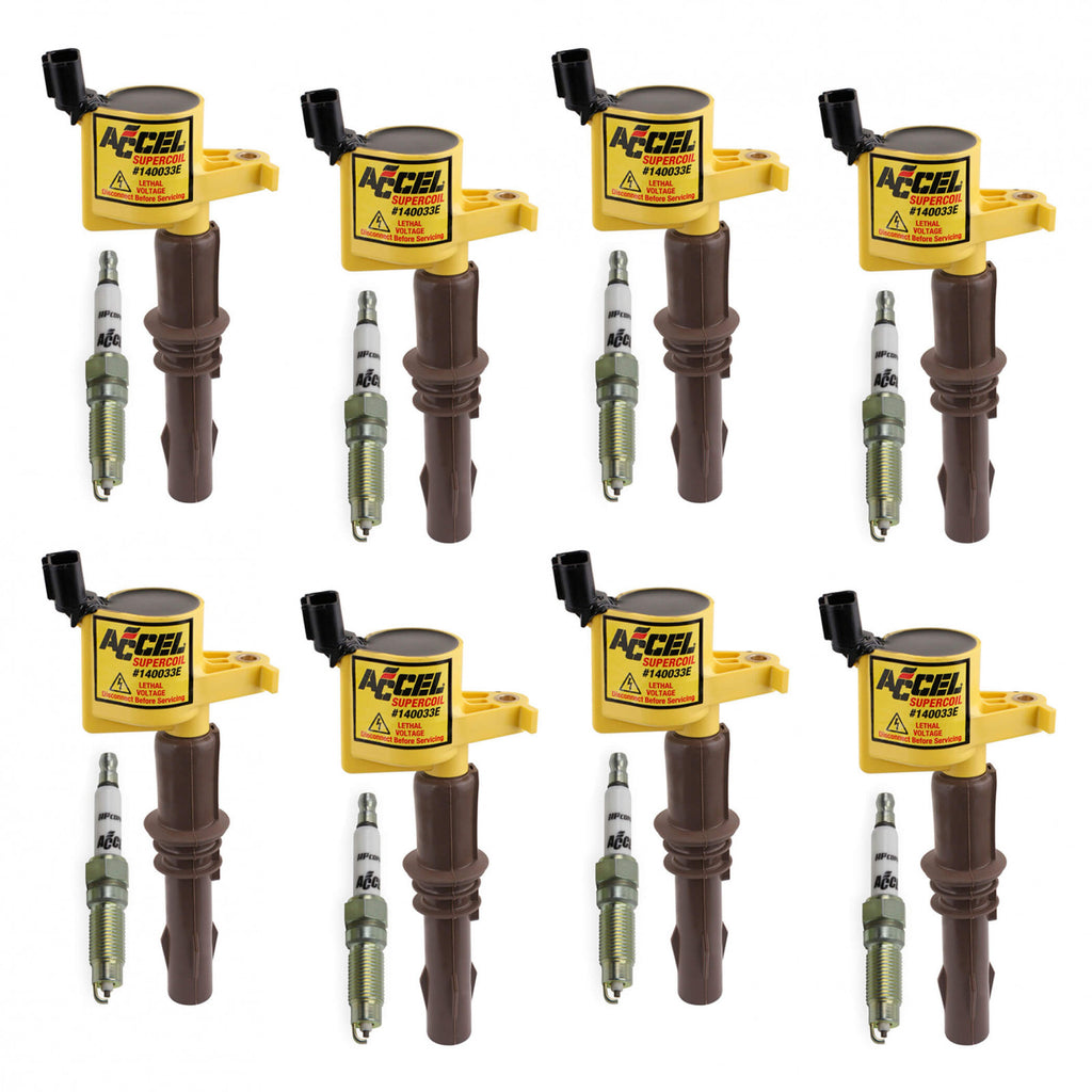 If you own a Ford car or truck with a 2 or 3 valve modular engine and want to get the most out of your ignition system then look no further! ACCEL now offers NEW Ignition Upgrade Kits. Not only will you get up to 15% more energy out of the ACCEL coils over the stock ones, you'll transfer more of that energy through the spark plug because of ACCEL's HP Copper Core Plugs (included in the kit). ACCEL's HP Copper Core Spark Plugs are better at delivering energy than platinum or iridium spark plugs and with their C-Cut design they'll light your air fuel mixture faster.