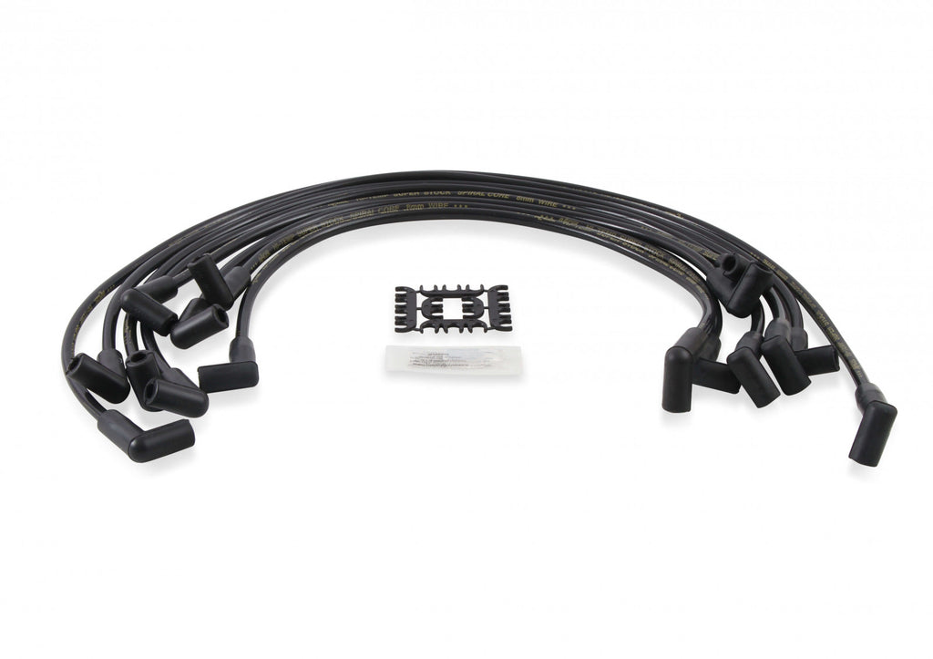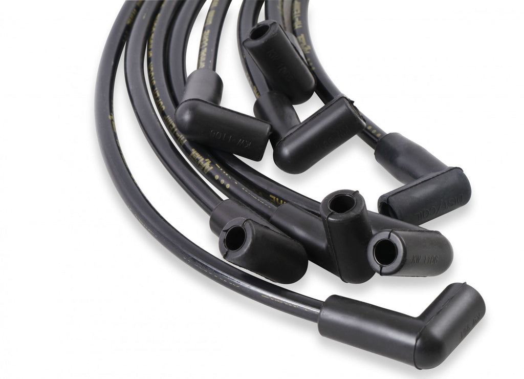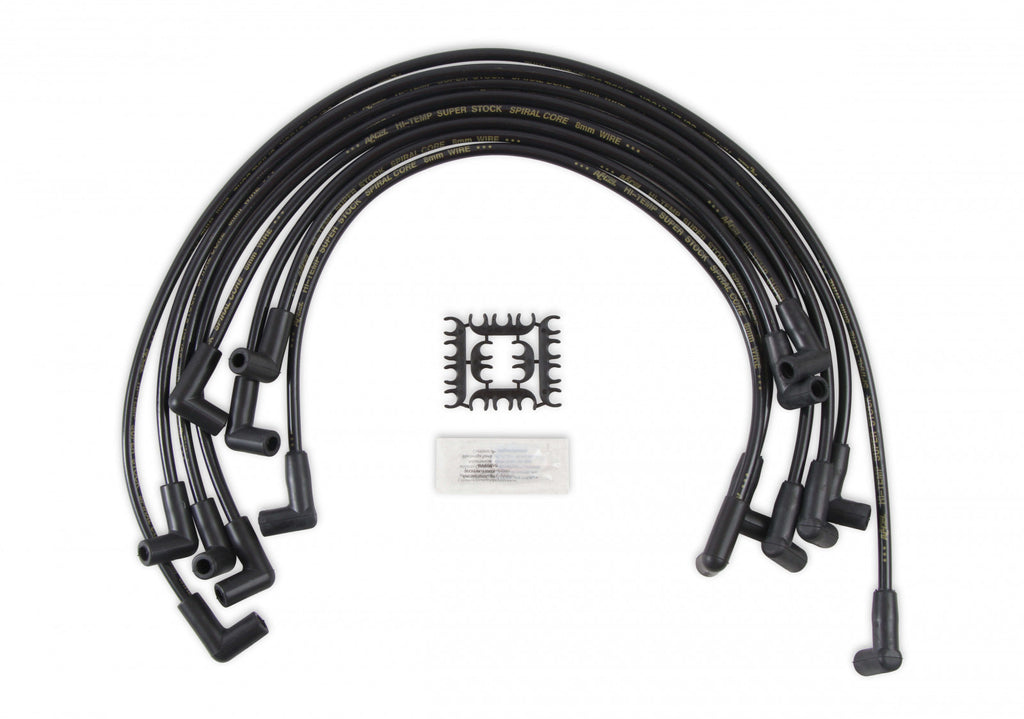 The traditional ACCEL combination of yellow wire and red spark plug boots has been added to these SuperStock Spiral Core 5000 Series wire sets, which feature color-matched wire and spark plug boots in blue, black, and red. With only 500 ohms/ft. of resistance, more ignition energy can reach the spark plug, producing a longer-lasting, hotter spark flame kernel. The results is higher performance through improved efficiency, quicker throttle response, and reduced emissions. This 8mm wire's double silicone construction is rated to 550 degrees F. The high-gloss wire jacket resists moisture, chemicals, and heat extremes for longer life and great looks. The fiberglass braid adds greater pull strength and terminal retention, while the stainless steel spark plug terminals provide excellent long life, electrical conductivity, and corrosion resistance. Both universal and custom-fit applications are available for early and late model cars and trucks.
