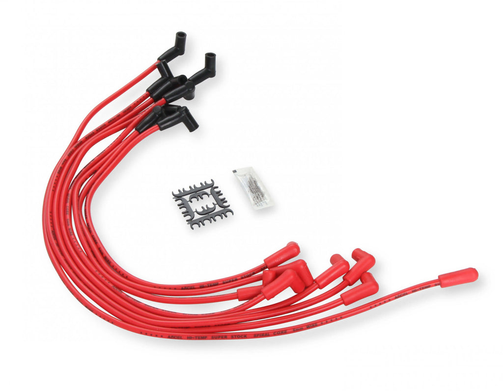 The traditional ACCEL combination of yellow wire and red spark plug boots has been added to these SuperStock Spiral Core 5000 Series wire sets, which feature color-matched wire and spark plug boots in blue, black, and red. With only 500 ohms/ft. of resistance, more ignition energy can reach the spark plug, producing a longer-lasting, hotter spark flame kernel. The results is higher performance through improved efficiency, quicker throttle response, and reduced emissions. This 8mm wire's double silicone construction is rated to 550 degrees F. The high-gloss wire jacket resists moisture, chemicals, and heat extremes for longer life and great looks. The fiberglass braid adds greater pull strength and terminal retention, while the stainless steel spark plug terminals provide excellent long life, electrical conductivity, and corrosion resistance. Both universal and custom-fit applications are available for early and late model cars and trucks.
