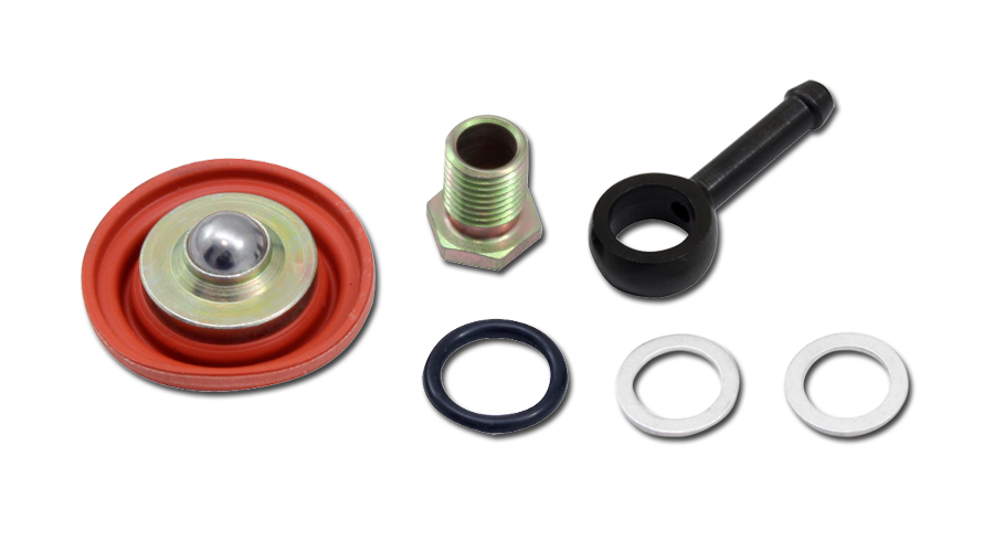 AEM replacement parts for its adjustable fuel pressure regulators include a rebuild kit that includes a diaphragm, interchangeable discharge ports and O-ring, vacuum fitting and multiple barb fitting types.