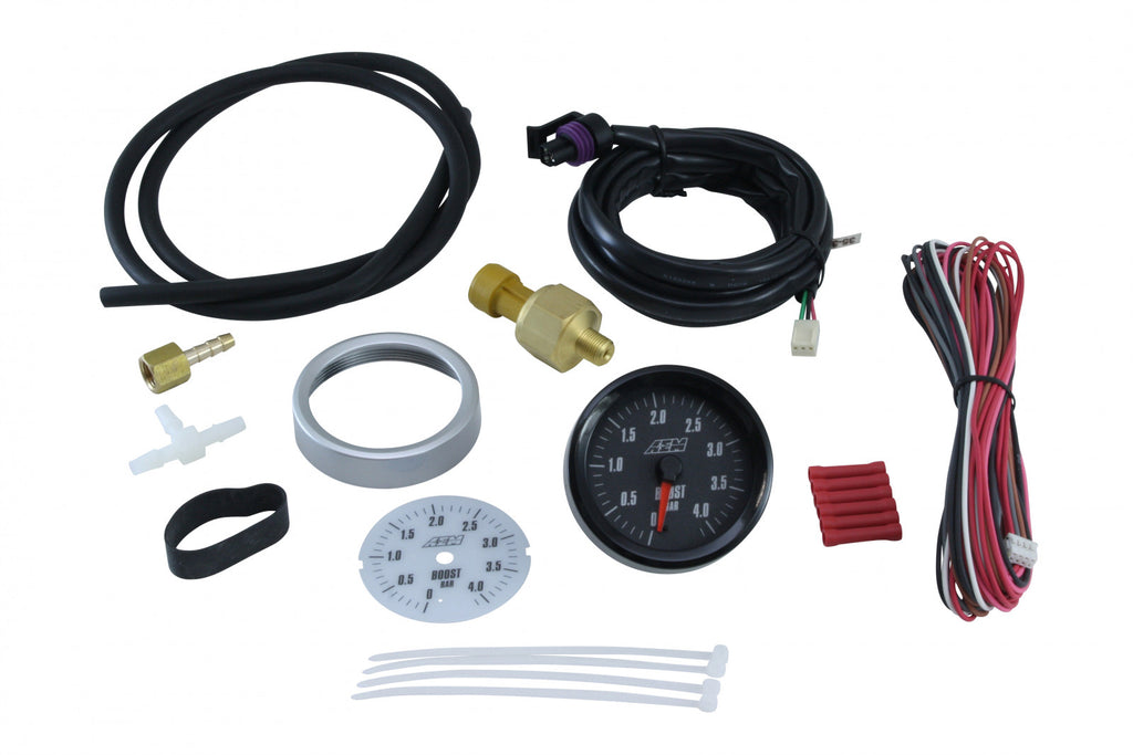 AEM's 0-4.1BAR Boost Gauge unites unsurpassed accuracy, speed and control with an easy to read, analog interface. The AEM analog gauge also offer a 0-5v analog output for use with data loggers and virtually any engine management system, such as the AEM EMS or FIC.