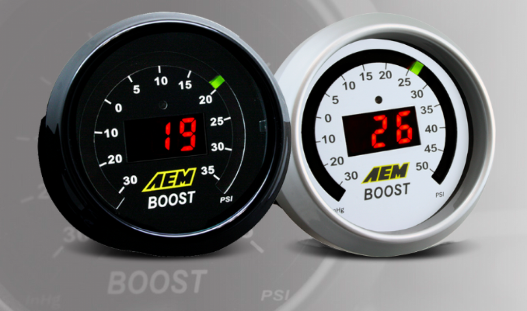 AEM's Digital Boost Display Gauges combine unsurpassed accuracy, speed and control with an easy-to-read digital LED interface that displays boost in 1 PSI increments, and a sweeping LED "needle" that lines the edge and moves as boost from 0 to up to 50 PSI. The boost gauge's digital readout will automatically increase and decrease in intensity due to the built in ambient light sensing photocell. AEM's digital boost gauges include a 0-5v analog output for use with data loggers and virtually any engine management system, such as the Infinity ECU, Series 2 EMS or AQ-1 Data Logger, making it the perfect solution for users who need to monitor and data log boost at high RPM on tuned engines. Each gauge includes interchangeable silver and black bezels and black and white faceplates to personalize the look of your gauge. Black bezel and faceplate included. Please email us after ordering if you would like the white bezel and faceplate