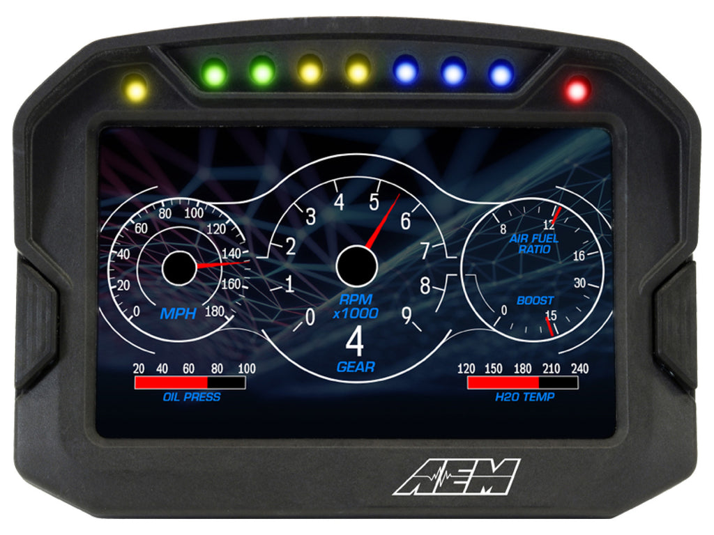 The CD-5 Carbon receives channels from two independent CAN bus inputs and it does not require special modules to read AEM and/or 3rd-party CAN signals. We have validated it to communicate with over 250 non-AEM devices, 2008-up stock ECUs via the OBDII port (see Supported Apps Tab), and the CD-5 Carbon can be added to any vehicle with the addition of our 22 Channel CAN Sensor Module. The CD-5 Carbon is ECU CAN ready and does not require external modules for CAN to CAN communication, just load your configuration and go! All channels can be named in virtually any language so that the information displayed makes sense to the user when displayed, whether on the main screens or warning alerts. Third-party systems will require download of 3rd party DBC CAN bus protocol files for proper operation if they are not included in our setup software. We currently have over 250 validated 3rd party applications, and include a CD Dash Power Cable to simplify the installation of 3rd party devices. We have also developed 3rd Party Plug & Play Adapter Cables for certain applications, please contact AEM for a full list of supported applications.