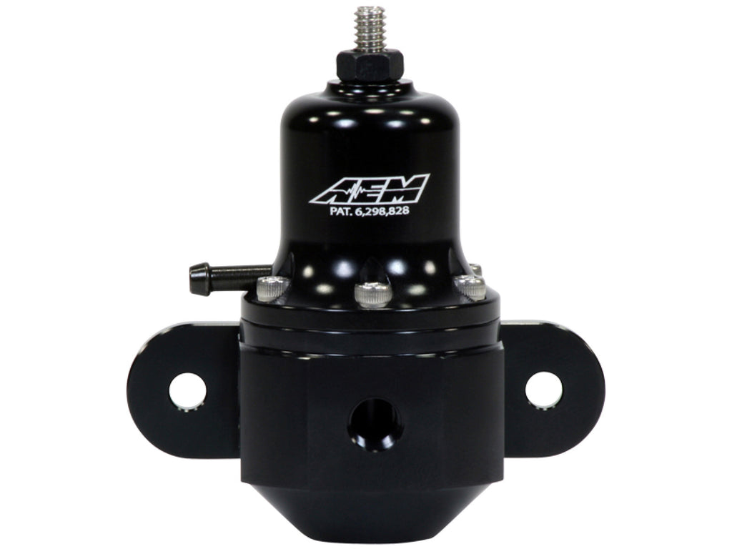 AEM's High Cap Universal Adjustable Fuel Pressure Regulator (PN 25-305BK) is the perfect solution for racers who need reliable fuel pressure in high-boost vehicles and racecars that require a large volume of fuel delivery. A longer spring provides for a wider range of adjustment (from 40 to 130 PSI). An easy-to-adjust set screw stands up to repeated adjustments. A single large return orifice is designed to handle high rate flow pumps. The regulator has a 1:1 rising pressure rate for boosted applications, and it is alcohol fuel and race fuel compatible. The High Cap Universal FPR is tapped to accept a 9/16”-18 O-Ring sealed fittings for inlet and return, and includes a 1/8 NPT port for a fuel pressure gauge or pressure sensor pick up. Features: