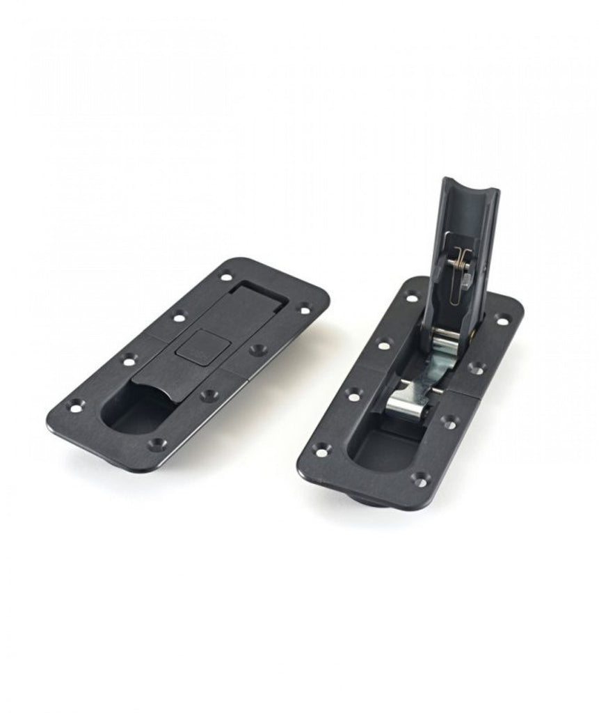 High strength tension latch for drawing together panels with the added feature of a shear engagement tongue which allows the latch to carry loads in 3 axes. The quick release function with secondary lock and hold-out handle make panel assembly and disassembly simple. Key Features