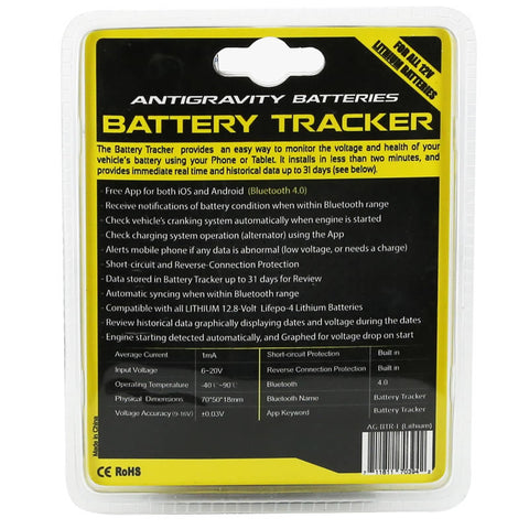 The Antigravity Battery Tracker monitors your vehicle battery status through your phone or tablet by using our free Battery Tracker App (iOS or Android, Bluetooth 4.0). The app has three main pages: Voltage Test, Cranking Test and Charging Test. The simple interface makes it easy to monitor the battery’s voltage, automatically check its performance during starting, and test your alternator’s charging operation. You can view real-time data as well as historical results (31 days) that graphically displays the dates, voltages and more. The tracker will even send a warning to your phone if your battery is getting low and needs a charge. You can choose the alerts and notifications you want to receive.