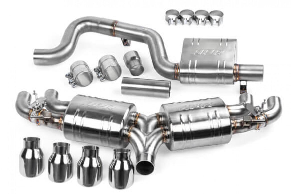 The APR Catback Exhaust System personalizes your vehicle's looks, sound and performance. Beautifully hand-crafted T304-stainless-steel components adorn the system with stunning TIG-welding throughout. Our straight-through brushed-finished mufflers smooth the exhaust note to a deep growl, without adding restrictions, while our Helmholtz resonator reduces unwanted frequencies. Strong high-quality bracketry and OEM-style clamps hold the system steadily in place, making the install or removal a snap, and fitment simple, yet precise. A cast 3" to quad 2.5" rear splitter creates an ultra-smooth transition, steadily feeding exhaust gasses out of the system, while looking tidy from under the rear bumper. Our cast valve housings enable the vehicle to be fitted with the factory electronic valve actuators, retaining OEM valve operation. Finally, removable 4" polished slash-cut exhaust tips finish the system, adding a classy motorsport-inspired touch to the rear of the vehicle.