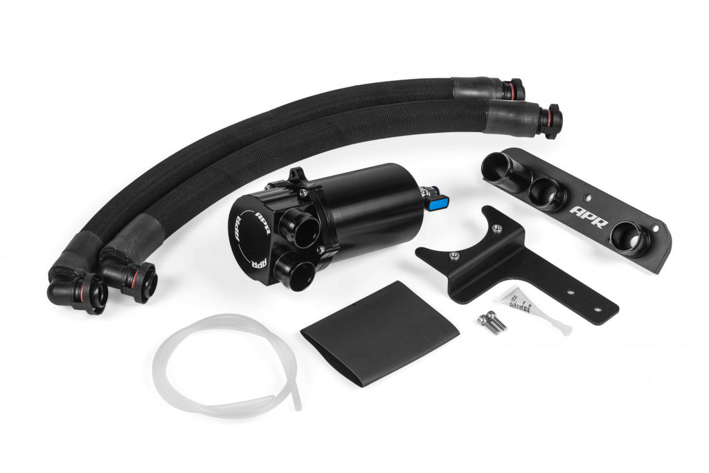 The APR Oil Catch Can System replaces the failure prone factory positive crank ventilation (PCV) system and traps excessive crankcase oil vapors and gunk from entering the engine. The system eliminates a common performance robbing boost leak, while reducing carbon buildup on intake valves, octane lowering oil vapors and oil pooling within the intake tract. It's a simple modification to install, drains in seconds with the flick of a knob, and is recommended at all stages of performance.