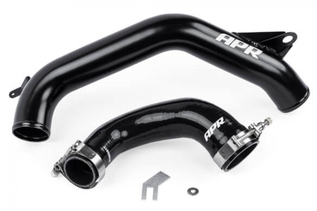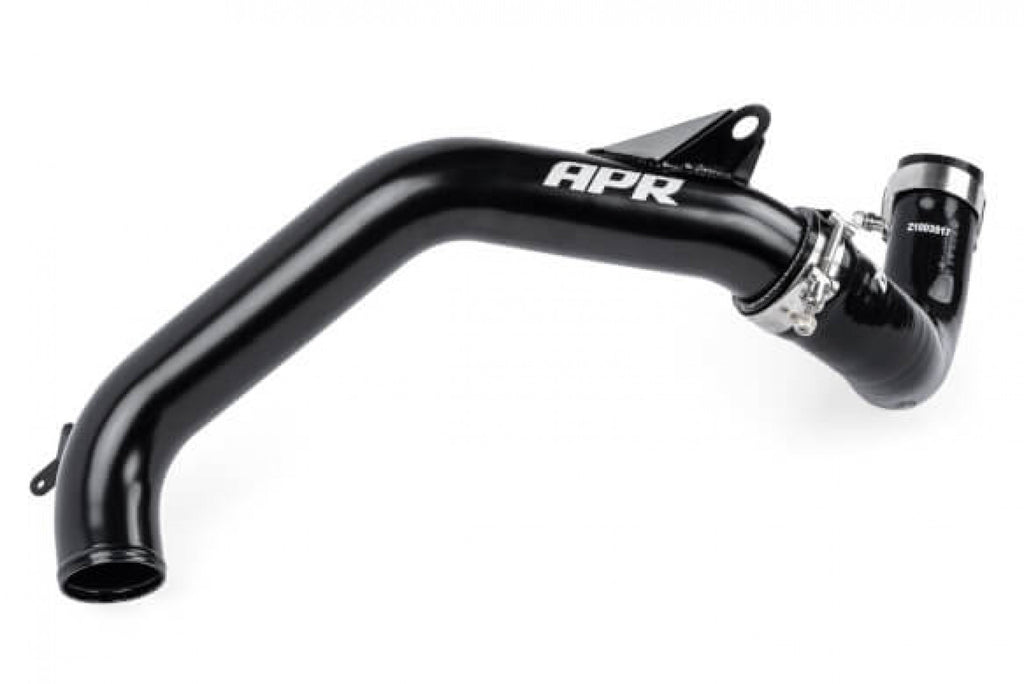 The APR Charge Pipe System is a comprehensive, direct replacement upgrade, to the factory system. The factory plastic and rubber turbo outlet pipe is a small and restrictive 38mm pipe that has shown to melt, deform, and cause boost leaks under extreme conditions. The APR System remedies this by upgrading the system to a larger 60mm aluminum pipe, along with a new multi-ply fluorosilicone coated turbocharger outlet hose. APR EZ-Flow stepped lip hoses provide a smooth transition from hose to pipe, and the included T-bolt clamps ensure a strong and leak-resistant seal at the pipe. All brackets are TIG-welded for a strong and precise fit, and the pipe is coated black. A protruding lip at the edge of the pipe helps prevent hose slippage. This pipe is a direct fit to the OEM turbocharger and the APR or OEM intercooler hose. APR Recommends upgrading the intercooler hoses as well for maximum performance and reliability.