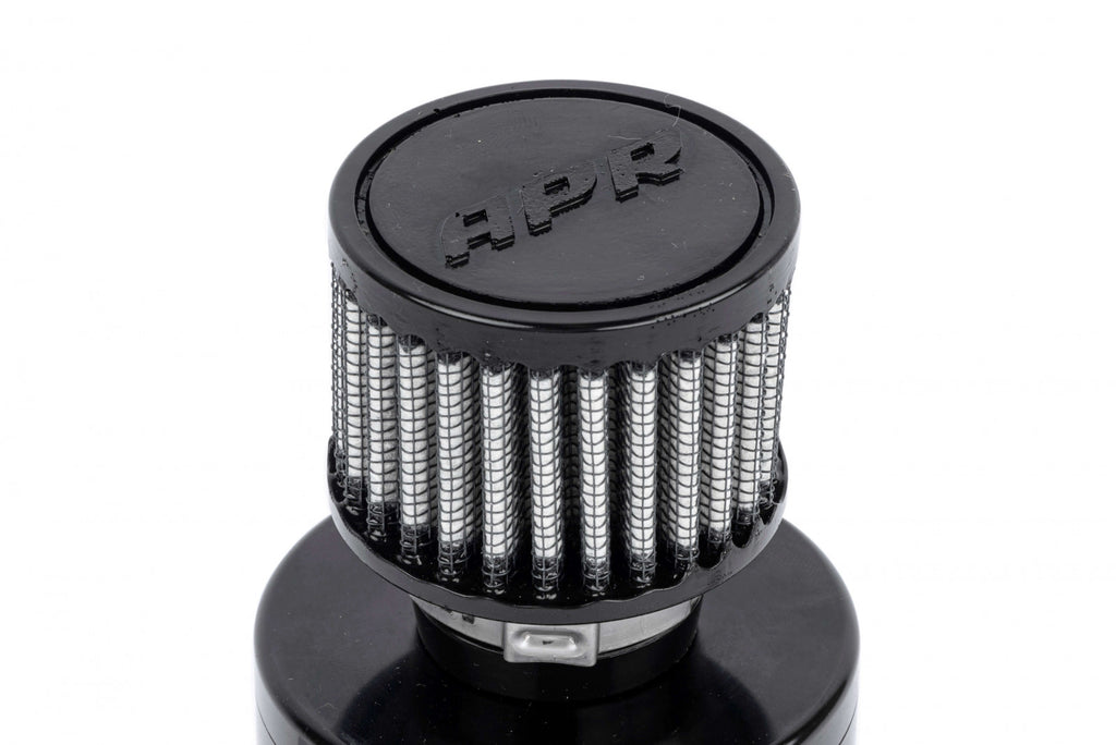 The Ultimate DQ500 DSG / S Tronic Transmission Catch Can and Breather System is here! The factory transmission features a plastic breather system that allows for transmission fluid expansion and removal of gases. Unfortunately, this system easily becomes taxed, causing transmission fluid to spew all over the engine bay. The APR system fixes this problem through the use of an easy-to-install and compact catch can system. The larger can collects the expanded fluids and allows for venting of trapped gases through a breather filter. The can is larger than stock and fluids enter at an angle to help prevent the fluids from spraying through the breather filter. When possible, the transmission fluid simply drains back into the transmission.
