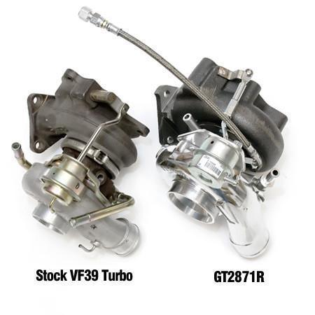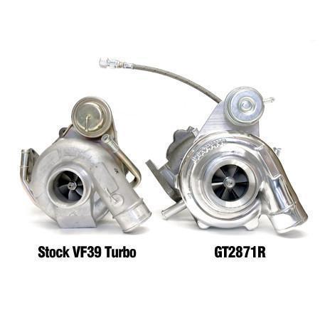 Bigger than the GT28RS, ATP's GT2871R has slower spool, but can handle around 400 horsepower. This is a good turbo for built-engine 2.0L WRXs that don't mind adding some lag for some more top-end performance. This turbo is still pretty small for a 2.5L, but will have rapid spool if you decide to go that route. The GT2871R uses a 53.85mm 76 trim turbine wheel and 71mm, 56 trim compressor wheel.