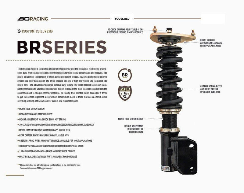 The BC Racing BR series coilovers are the perfect choice for street driving with a dash of weekend warrior track action. Featuring easily accessible adjustment knobs and separately adjustable ride height, the BR series makes adjusting and maintaining your performance coilover system easier than ever. Ride height is independently user adjustable so you can dial in the exact look to reflect your driving style and performance needs. BC’s patented concave lower locking ring keeps all adjustments locked in and ready for precise predicable feed back in any scenario. BR series coilovers provide a strong, complete and attractive coilover system at a great price.