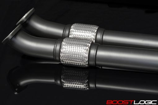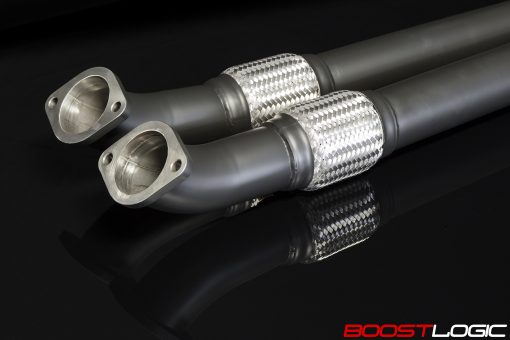 Made from 100% 304 stainless steel construction. 2 x 75mm tube into 1 x 90mm for the best sound and power. Proper merge collector for the highest airflow. The two flex sections allows for easy installation and engine sway. Coated with high temp ceramic to minimize heat.
