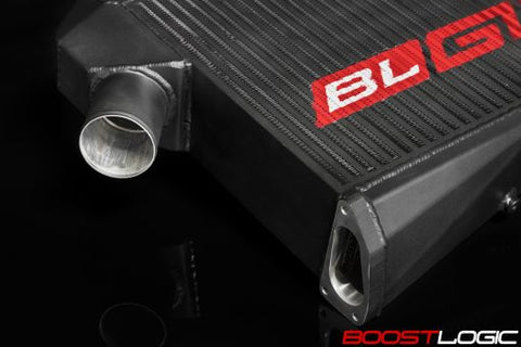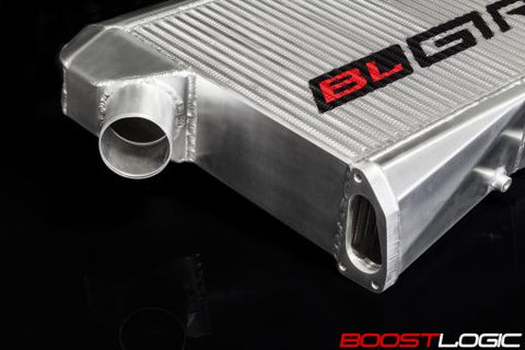 Boost Logic has specifically designed this intercooler with high boost and high power applications in mind. The end tanks are constructed with lightweight aluminum and the upper end tank flows the outlet air through a tailored chamber while making its curved exit. The end tank is also designed to have minimal intercooler piping which prevents pipes from blowing off in hard to reach areas. Boost Logic are using their custom tailored tight fin cores which create the highest cooling effect possible. This intercooler can be used with factory intercooler piping or the Boost Logic one piece mandrel bent intercooler piping kits which are available in both polished and black powder coat finishes.