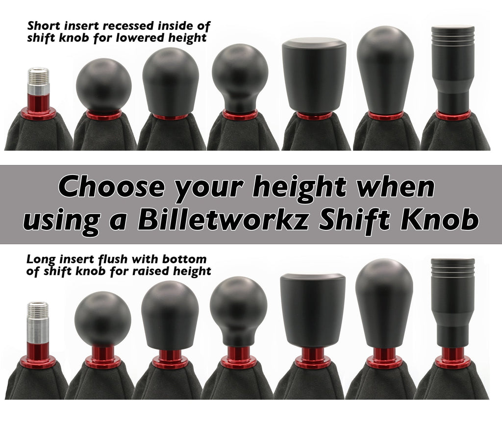 If using a Billetworkz Shift Knob, you will have the ability to set the height of the shift knob. The shift knob can sit down on the flange, or raised up for added height. The height will be dependent on the threaded insert installed in the knob. If the threaded insert is recessed in the knob, the knob will sit on the flange of the Boot Retainer. If the threaded insert is flush with the bottom of the knob, the knob will sit at the higher height and expose the Boot Retainer.