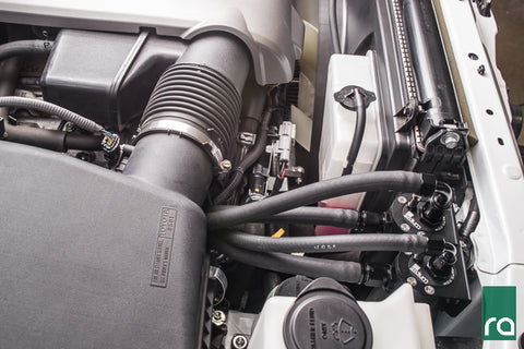 This installation kit was specifically designed for the 2007-2021 Toyota Tundra with the 3UR-FE engine. There is no drilling or permanent modifications required. IF USING A TRD OR OTHER AFTERMARKET SUPERCHARGER, please check the pictures carefully to make sure the location of the catch cans is not occupied by intercooler plumbing or other related supercharger components.
