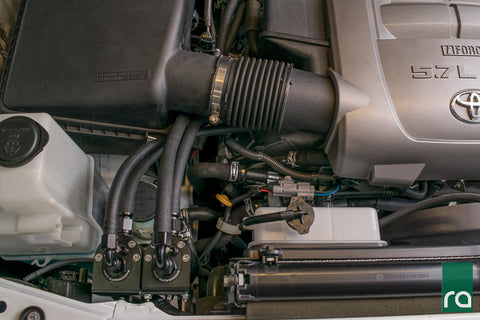 Radium Engineering offers two independent Tundra oil catch can kits that are sold individually or together. They do NOT vent to atmosphere (VTA), thus are emissions and track legal. Closed loop systems route clean filtered air back in through the engine to be burned and to promote negative crankcase pressure for optimal performance. Furthermore, closed systems prevent unwanted oil vapors from entering into the cabin.