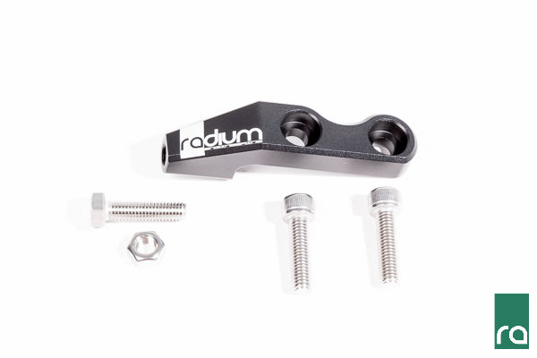 The Radium Engineering clutch fork return stop addresses a common problem on the Mitsubishi EVO pull-type clutch slave cylinder. During hard shifting and fast clutch pedal operation, the clutch fork can return too far and cause the throw-out bearing to become unclipped from the clutch fork. This results in expensive transmission removal to fix. The Radium clutch return stop prevents the fork from over-traveling, eliminating a throw-out bearing issue. Inexpensive insurance to protect your clutch.