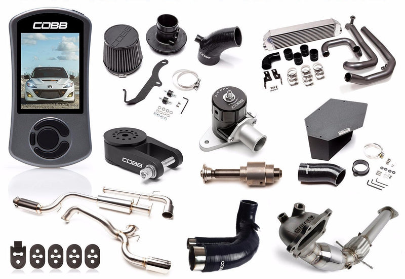 The Stage 3 Power Pack includes: COBB Accessport - The most comprehensive MAZDASPEED OEM ECU tuning solution available. SF Intake - Power, looks and sound! Turbo Inlet Hose - Rejects high engine bay temperatures. FMIC - More consistent power with the coolest possible air! XLE BPV - Fast and functional. Turboback - These components offer excellent power gains, outstanding build quality and an impressive exhaust note. Rear Engine Mount - Improve traction and reduce wheel hop! Fuel Pump Upgrade - Achieve flow rates ~50% higher than the original pump. Exhaust Hanger Kit - Exhaust Hangers will keep your exhaust firmly in place. COBB Vehicle Badge: Custom chrome emblem; individual letters with 3D curvature included! The Stage Power Pack comes in your choice of either blue or black color for the SF Intake, Turbo Inlet hose, and FMIC.