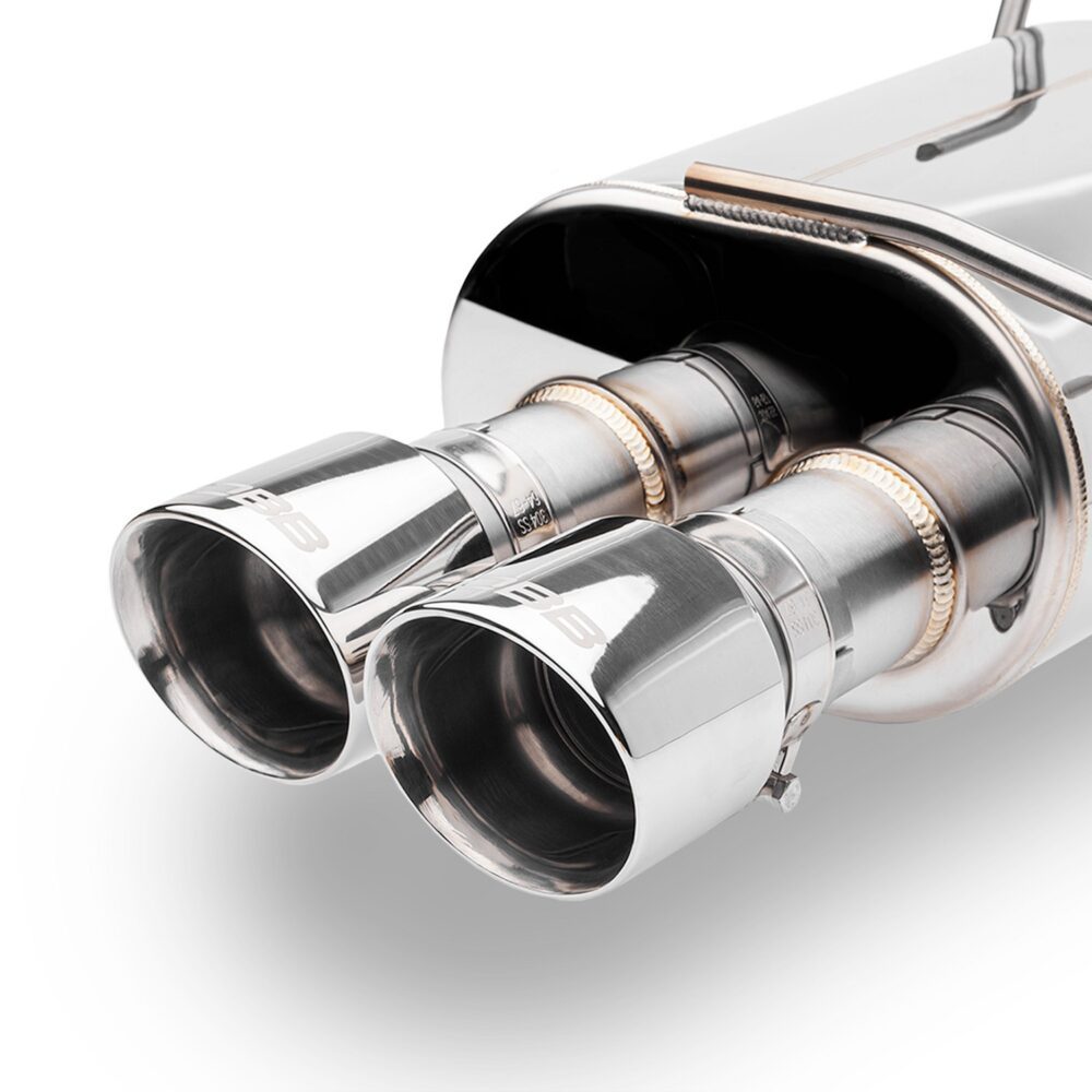 - The exhaust system from COBB Tuning contains two bespoke mufflers, each featuring a single 2.5″ inlet and dual 2.5″ outlets. These mufflers connect to the Y-pipe using durable cast flanges. The outlets are designed to accept 3.5″ dual-wall, slash-cut tips, each etched with the COBB logo, lending a touch of sophistication to the vehicle.