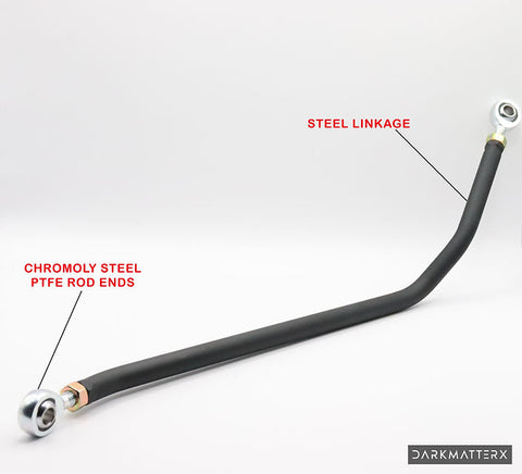 The DM-2 uses steel linkage with chromoly steel, PTFE lined rod ends that connect the shifter to the transmission shift plate. Our linkage allows the transmission to perform pitching and rolling movements for stress free shifting in corners and hard acceleration.