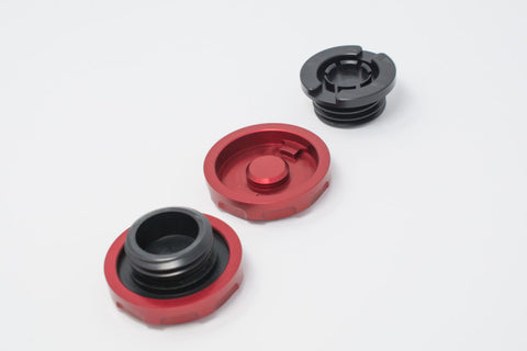 The Renegade Motorsports Delrin Aluminum Hybrid Oil Cap is now Available! This Cap allows you to maintain the styling of our signature billet aluminum replacement caps without burning your fingers! Now you can have your cake and eat it too! The Cap consists of an Aluminum top piece that will perfectly match the rest of our caps, and a black Delrin threaded insert that limits heat conduction from the block. Both parts are fully CNC machined to exacting tolerances to provide you with perfect fit and finish!