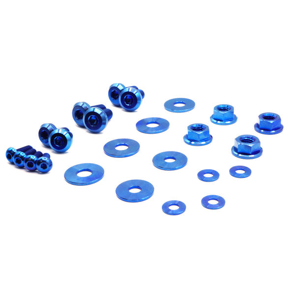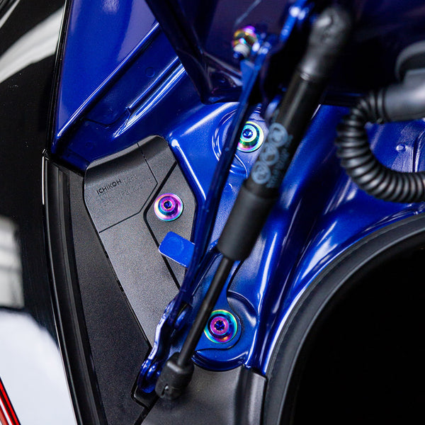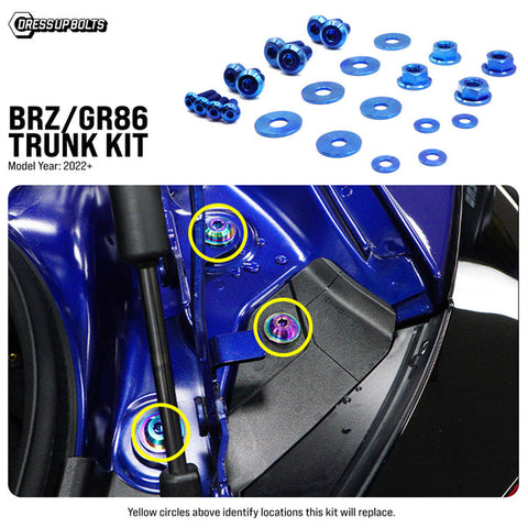 Our 24 piece trunk kit includes bolts and washers manufactured from extremely durable, anticorrosive, and lightweight GR5 titanium metal. The kit is designed for the 2022+ BRZ and GR86.
