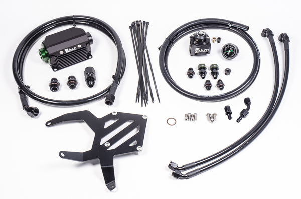The fuel filter is secured to an inline Radium fuel presssure gauge which is attached to an adjustable Radium fuel pressure regulator. The FPR can be used to mimic the OEM fuel system or it can be ran 1:1 with a vacuum reference. -6AN PTFE hoses are included to connect to the fuel rail and high pressure fuel pump.