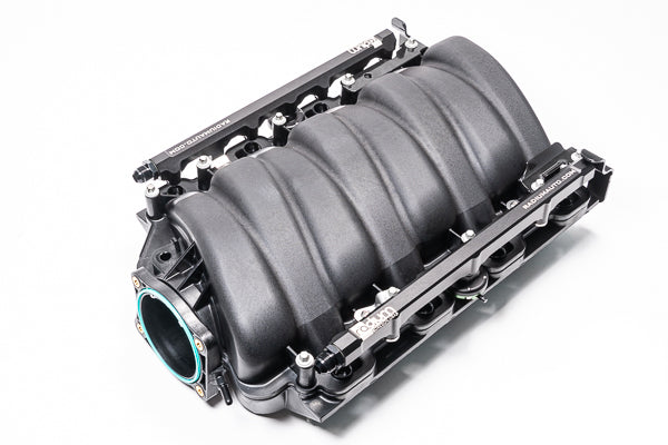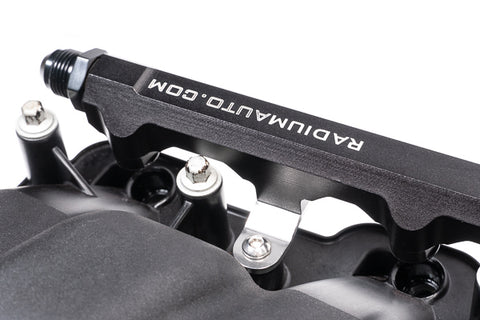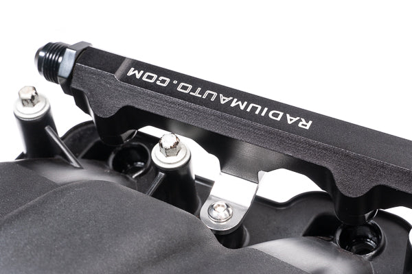 Manufactured with a large 0.69" internal bore, the fuel rails can support all necessary engine power requirements. They are CNC machined from extruded 6063 aluminum, black anodized, and laser etched for a high quality surface finish. All end ports are machined with 8AN ORB (3/4-16 female) threads. The lower center ports can be used for optional adapters and are also tapped with 8AN ORB (3/4-16 female) threads.