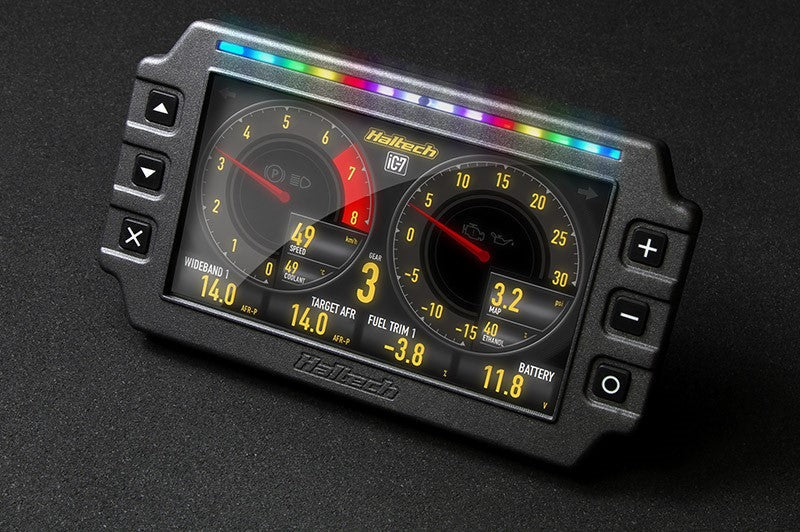 With a crisp, clear and full colour display, the all new Haltech iC-7 Display Dash lets you see things in a brand new way. Designed and manufactured in Australia with motoring enthusiasts in mind, the iC-7 offers market-leading features in a unique, state-of-the-art package. Featuring auto-dimming ambient light reactive brightness, user-programmable multi-colour shift light bar, the iC-7 connects directly to all current Haltech ECUs via a CAN network.