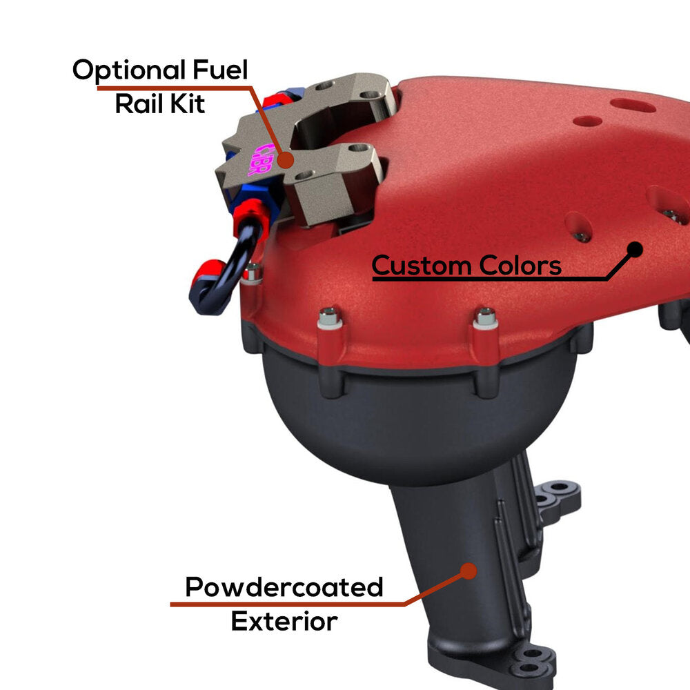 Our intake manifold was designed with the latest in CFD flow modeling with designs being optimized around the dynamic flow conditions found inside of intake manifolds. The design looks different than anything else on the market for good reason. Controlling air velocities at every point in the manifold is critical to good flow throughout the RPM range. Nothing in this manifold has constant cross section or tube like features, every curve and cross section was analyzed and engineered for optimum efficiency.