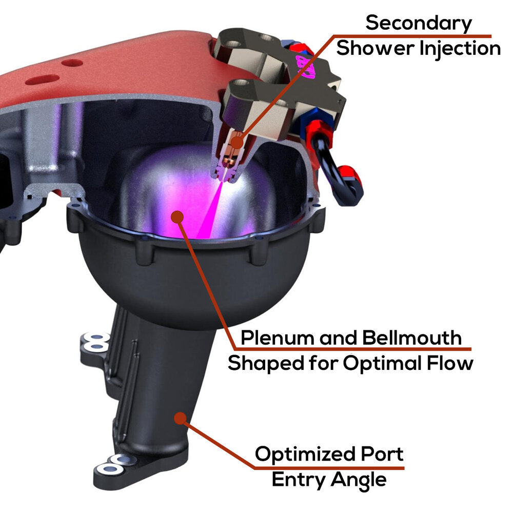The manifold can either be run with our without secondary shower injection This makes it great for pushing the limits on the stock fuel system while still giving you the option to add fuel later on. The shower injection sprays the fuel down into the individual bell mouths for each cylinder allowing more time for the fuel to phase change and further cool the intake charge, this will really increase the cooling potential for high ethanol blends in flex fuel equipped cars.