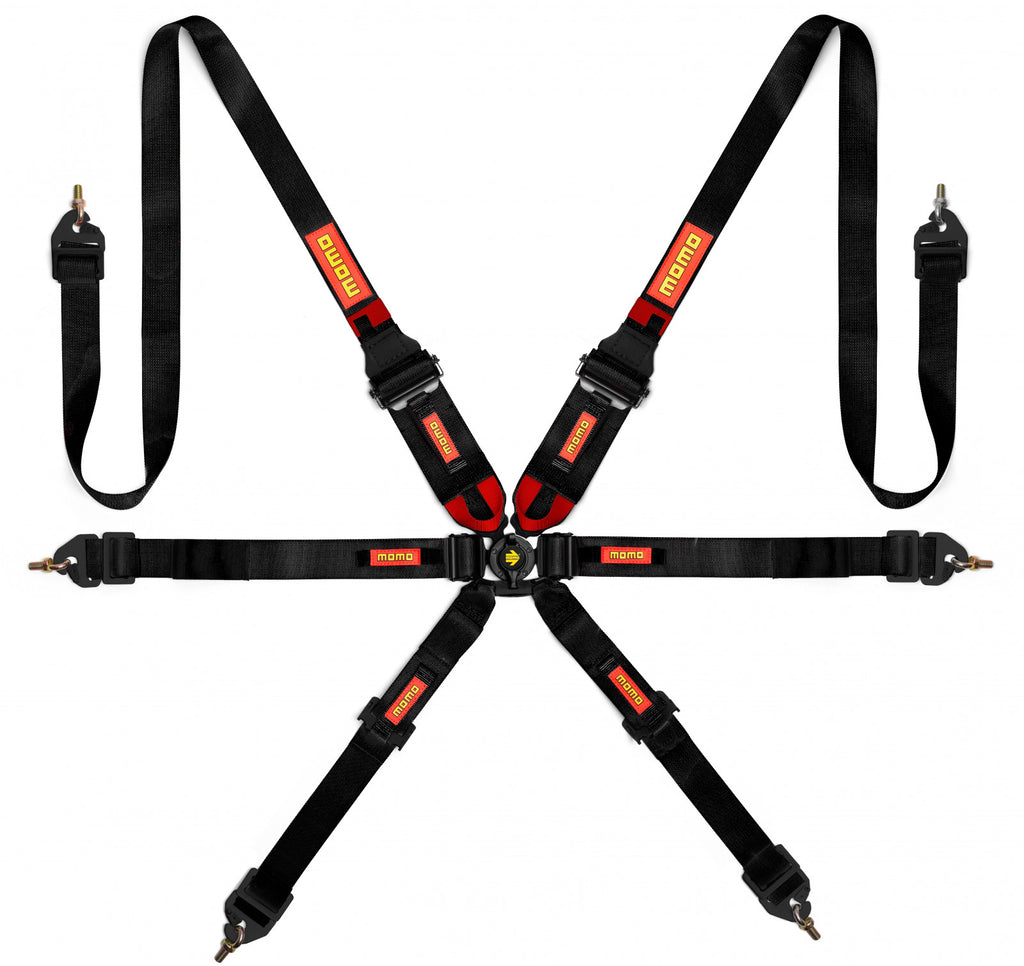 MOMO’s SR6 series six-point harnesses are the ideal safety upgrade offering professional-level lightweight hardware and adjustability for a customized fit. Featuring two-inch shoulder webbing, the SR6 series harnesses are designed to work with any frontal head restraint, including HANS® while also providing improved ease of use with MOMO’s advanced aluminum active speed adjusters. The two-inch lap belt offers drivers with improved pelvic containment creating faster loading of the lap belt resulting in reduced load transfer to the chest. The lap belt secures with a lightweight low-profile camlock specially constructed with ECI guides for quick and easy connection. Additional features include integrated lap adjusters incorporated directly onto the cam buckle offering the widest range of adjustability and ease of use. MOMO’s SR6 harnesses are also the ideal choice for endurance racing as the cam buckle is permanently affixed to the anti-sub straps resulting in faster driver changes. All points feature clip-in mounting and adjustable length adjustment through the use of the provided three-bar slide.