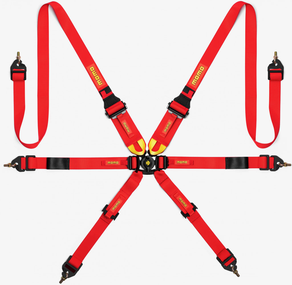 MOMO’s SR6 series six-point harnesses are the ideal safety upgrade offering professional-level lightweight hardware and adjustability for a customized fit. Featuring two-inch shoulder webbing, the SR6 series harnesses are designed to work with any frontal head restraint, including HANS® while also providing improved ease of use with MOMO’s advanced aluminum active speed adjusters. The two-inch lap belt offers drivers with improved pelvic containment creating faster loading of the lap belt resulting in reduced load transfer to the chest. The lap belt secures with a lightweight low-profile camlock specially constructed with ECI guides for quick and easy connection. Additional features include integrated lap adjusters incorporated directly onto the cam buckle offering the widest range of adjustability and ease of use. MOMO’s SR6 harnesses are also the ideal choice for endurance racing as the cam buckle is permanently affixed to the anti-sub straps resulting in faster driver changes. All points feature clip-in mounting and adjustable length adjustment through the use of the provided three-bar slide.