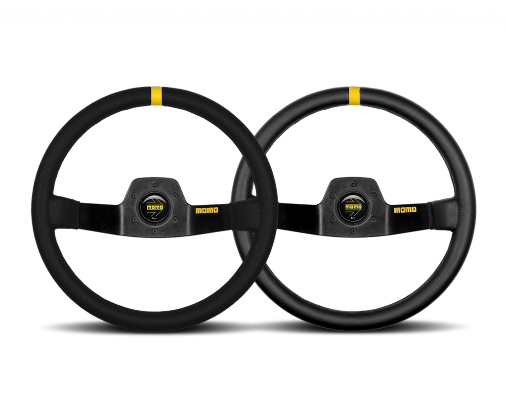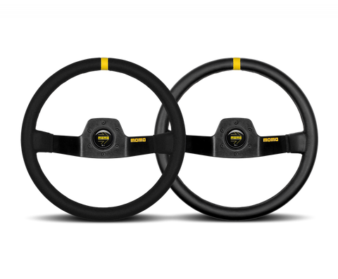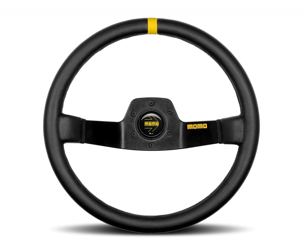 The MOMO MOD. 02 steering wheel is a traditional round design with a 350mm diameter and a unique 2-spoke design. A deep 87mm dish brings the wheel closer to the driver for easier steering input. A yellow centering stripe is also integrated into the design.