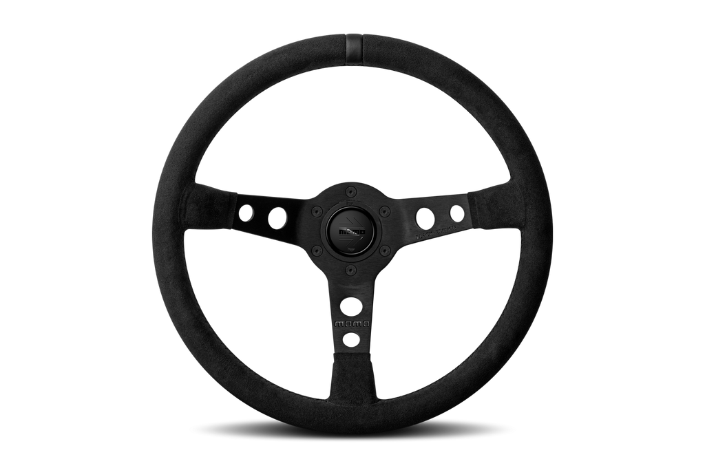 Inspired by rally driving, but usable in any application, the MOMO MOD. 07 steering wheel is a traditional round design with a 350mm diameter. A deeper 70mm dish brings the wheel closer to the driver for easier steering input. A yellow centering stripe is also integrated into the design. This is the Black edition of the wheel and comes with a horn button. It is pre-drilled with the standard 6-bolt pattern.