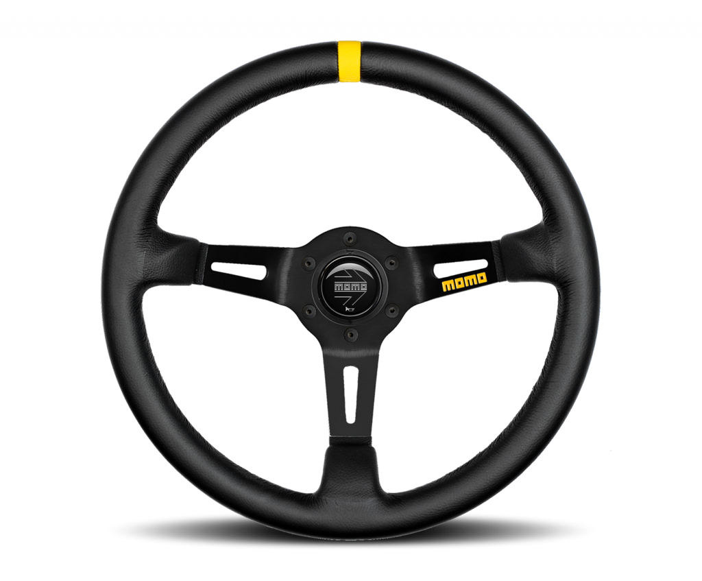 The MOMO MOD. 08 steering wheel has a deep 88mm dish, which is useful for older cars where the seating position is often further back. It also provides extra leverage for cars without power steering. The wheel features a 350mm diameter and a yellow centering stripe is also integrated into the design. The wheel comes with a horn button and is pre-drilled with the standard 6-bolt pattern. This is the black leather covered version.