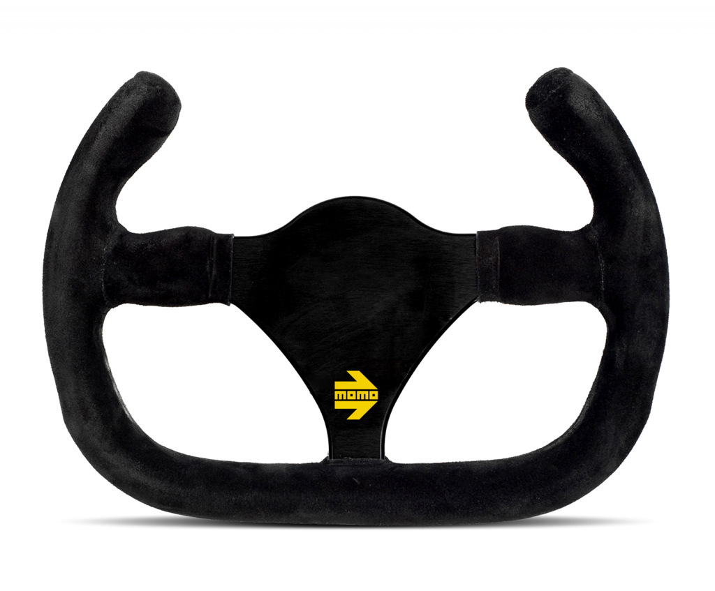 The MOMO MOD 27/C steering wheel is designed for confined sports car and racer cockpits who also need a better view of the gauges. The anatomically-designed rim is covered with premium suede. A flat bottom gives the driver better leg clearance. This version also features a cut top which allows for better gauge visibility. The MOMO MOD 27/C steering wheel has an anodized center with no drill holes. There is zero dish and the diameter is 270mm.