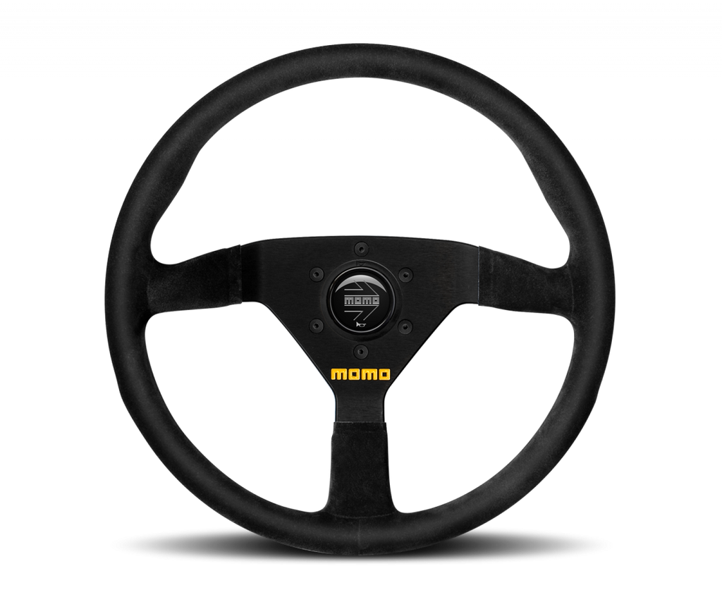 The MOMO MOD. 78 is a classic racing steering wheel popular with many drivers for its comfort and looks. The three-spoke pattern, circular form and thumb grips are what makes many racers feel that this is a natural fit to their car. Using the pre-drilled standard 6-bolt pattern makes for an easy install. A MOMO horn button is included. This 350mm diameter version in suede which has a 36mm dish. Spokes and suede are black.