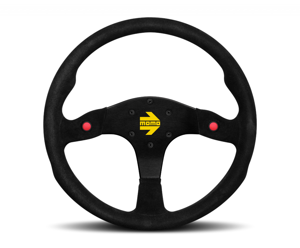 The MOMO MOD. 80 is a classic three-spoke racing steering wheel. The circular form and thumb/hand grips are what makes many racers feel that this is a natural fit to their car. Using the pre-drilled standard 6-bolt pattern makes for an easy install. This steering wheel is finished in suede and has a 350mm diameter with a 33mm dish. The leather and spokes are black. There is no center horn hole or horn button included.