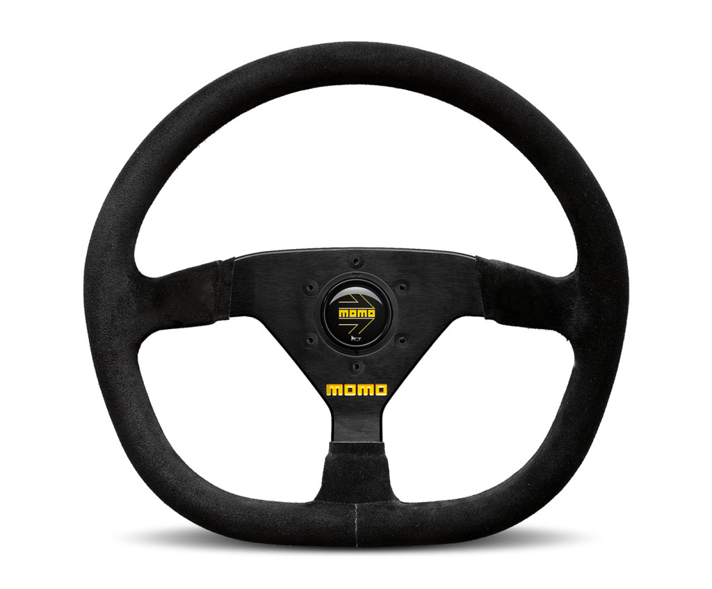 The MOMO MOD 88 racing steering wheel takes popular design cues from MOD 78, and incorporates a flat bottom. The MOMO MOD 88 racing steering wheel is a flat bottom design for easier entrance and exiting of racing sedans. MOMO MOD 88 features three anodized spokes with a thick round-section grip covered in premium suede. The wheel is drilled in the standard 6-hole pattern and includes a MOMO horn button. This is the 350mm diameter version with a 43mm dish.