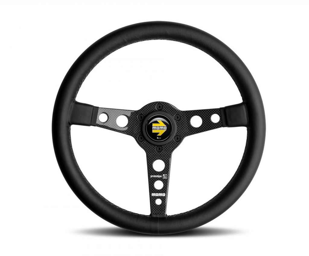 The timeless MOMO Prototipo steering wheel has a classic round rim with three cut-out spokes. The wheel is covered in black leather with white contrast stitching. The MOMO Prototipo steering wheel measures 350mm in diameter, making it ideal for larger sedans and GT cars. The grip section is 30mm x 29mm and a MOMO horn button is included. This is the carbon fiber spokes version.
