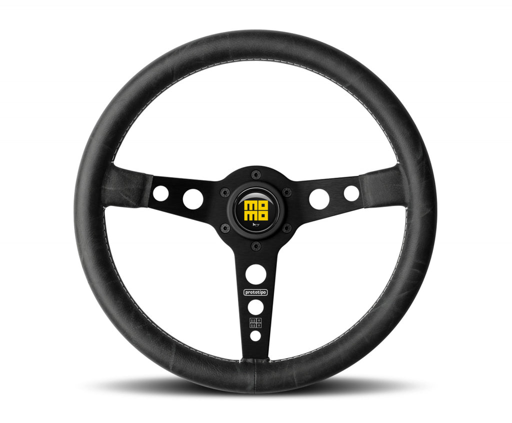 The timeless MOMO Prototipo steering wheel has a classic round rim with three cut-out spokes. The wheel is covered in black leather with white contrast stitching. The MOMO Prototipo steering wheel measures 350mm in diameter, making it ideal for larger sedans and GT cars. The grip section is 30mm x 29mm and a MOMO horn button is included. This is the black spokes version.