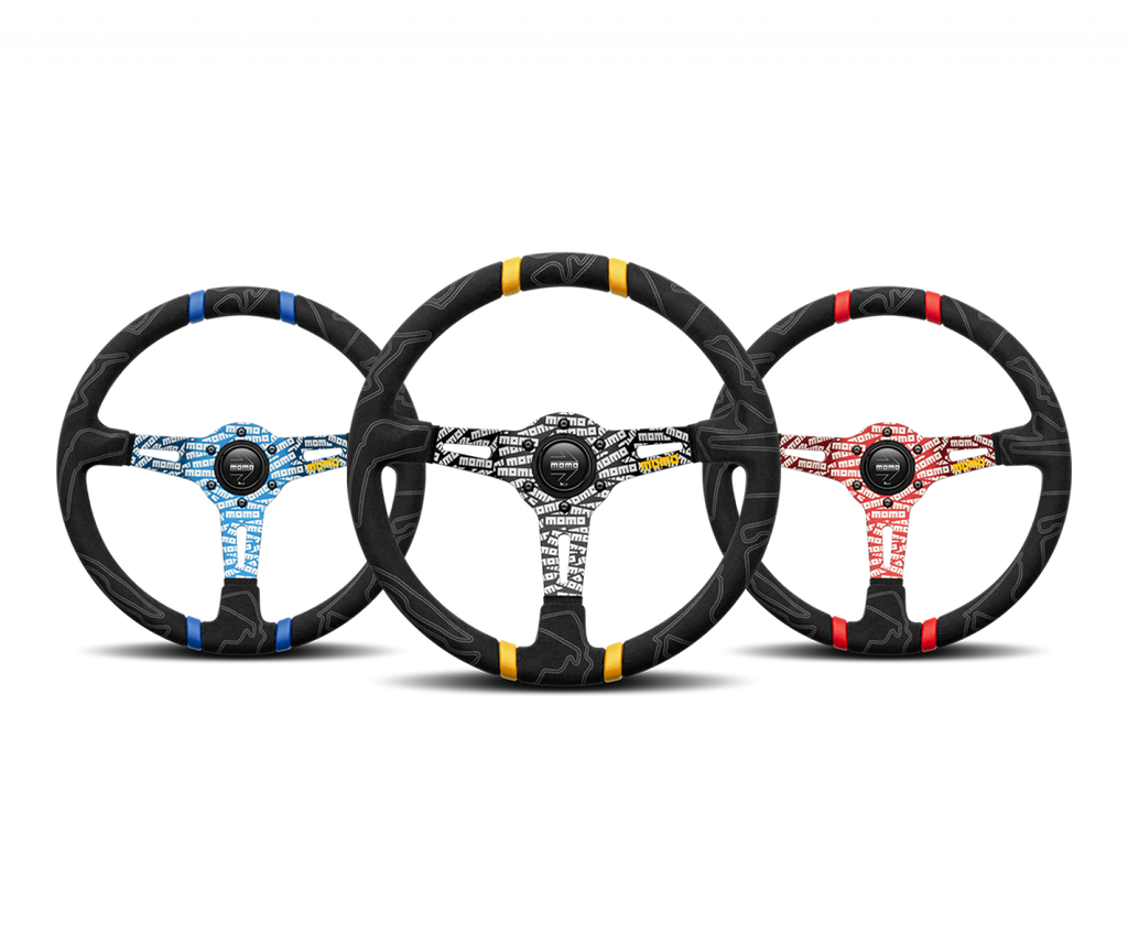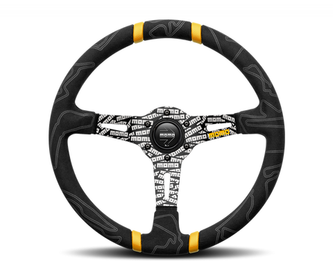 Elaborately etched with the MOMO logo through an innovative laser engraving process, the MOMO ULTRA steering wheel makes a bold statement. The Alcantara wrapped grip features silhouettes of the most famous racetracks from around the world: Monza, Nurburgring, Monte Carlo, Sepang and many more. The double leather inserts provide a stark contrast and serves as quick reference for extreme driving. 350mm by 90mm dish, 38mm by 28mm grip area. 6x70mm bolt pattern, comes with horn button. This listing is for the Black version.