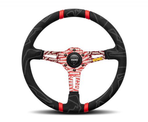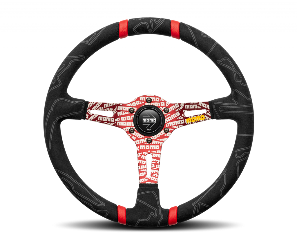 Elaborately etched with the MOMO logo through an innovative laser engraving process, the MOMO ULTRA steering wheel makes a bold statement. The Alcantara wrapped grip features silhouettes of the most famous racetracks from around the world: Monza, Nurburgring, Monte Carlo, Sepang and many more. The double leather inserts provide a stark contrast and serves as quick reference for extreme driving. 350mm by 90mm dish, 38mm by 28mm grip area. 6x70mm bolt pattern, comes with horn button. This listing is for the Red version.