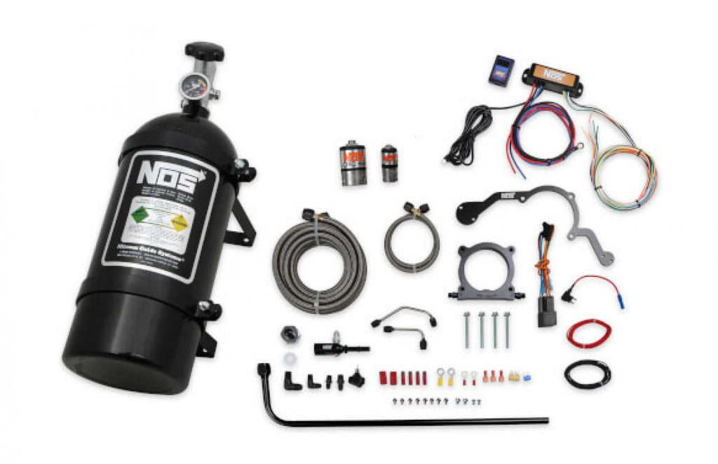NOS Our NOS systems include everything needed to install that extra power over the weekend. Along with all the nitrous and fuel related hardware, an NOS Mini 2-stage progressive controller is included for exceptionally smooth power delivery. The 80mm 1/2 inch thick nitrous plate is made from billet 6061-T6 aluminum then anodized black for great looks under the hood. NOS also includes a custom designed black anodized aluminum solenoid bracket with custom bent hard lines for that professional installation look.