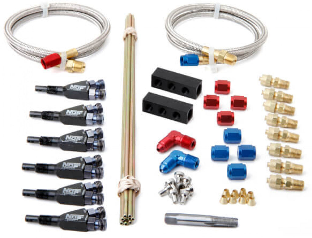 NOS Plumbing kits are offered for those needing only the components related to the intake Manifold plumbing of a direct port Injection kit. Proper quantities of nozzles, lines, jets, and appropriate Fittings are included.