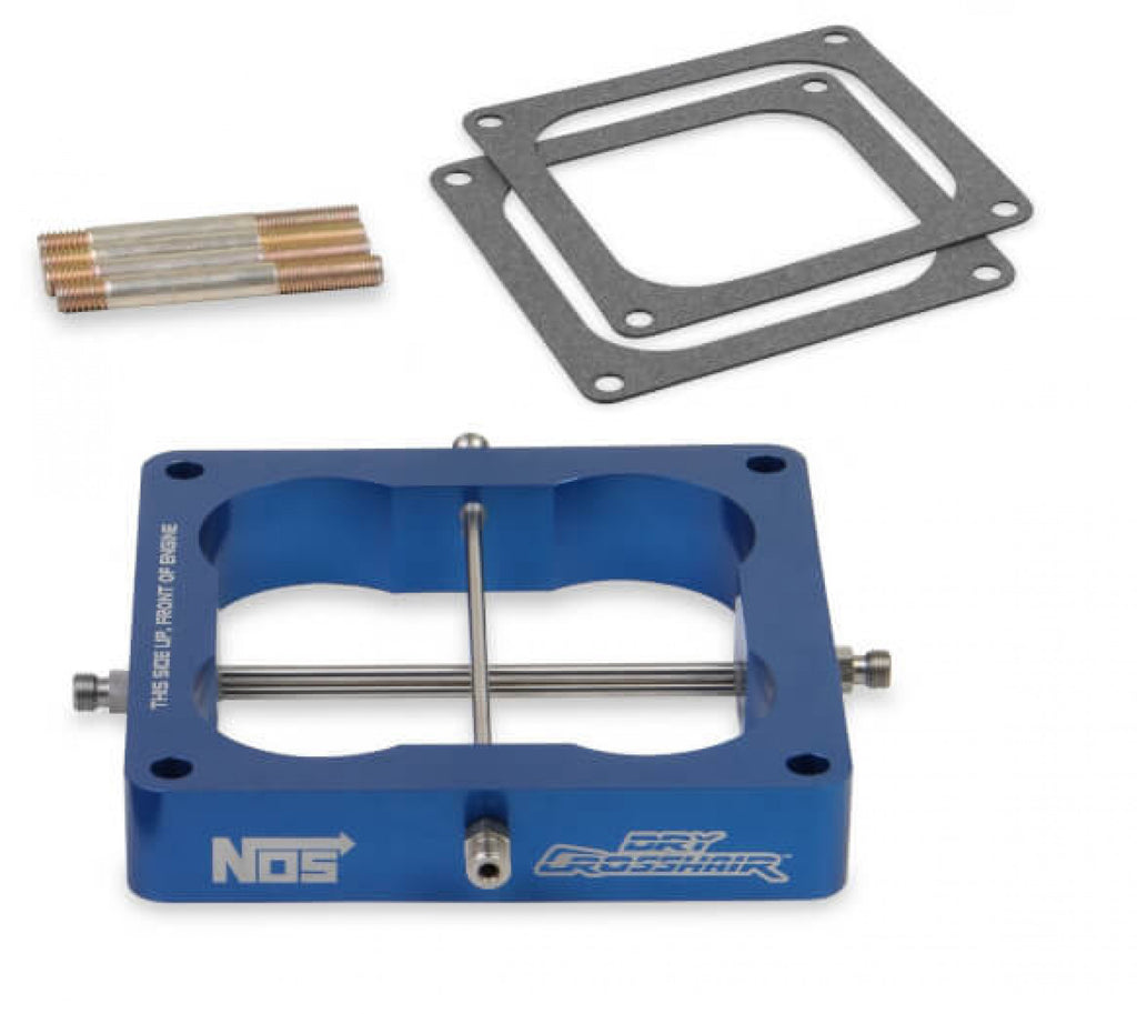 NOS NOS's new CrossHair(TM) plate systems have been designed with the serious racer in mind and are capable of 350 plus HP. Based off of the ever popular double cross plate systems, the CrossHair(TM) takes this time tested design and improved it for better distribution of the fuel and nitrous. This is especially important with the complex intake manifold designs out today. The CrossHair(TM) plate systems feature double down nitrous bars for improved distribution and atomization, along with new track tested tune up's. The new CrossHair(TM) nitrous plates will give you the power you need, when you need it. CrossHair(TM) kits come with a blue anodized CrossHair(TM) plate in Holley 4150(TM) bolt patterns, jetting, plumbing and hardware. Available separately, NOS offers electrical wiring kits and bottle kits in a variety of combinations so you can make up your own custom kit combination.